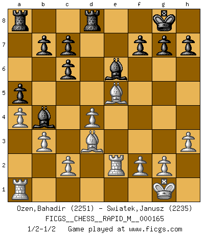 Last move : 1/2-1/2 2025 April 14 23:15:45 [Event "FICGS__CHESS__RAPID_M__000165"] [Site "FICGS"] [Date "2025.03.05"] [Round "1"] [White "Ozen,Bahadir"] [Black "Swiatek,Janusz"] [Result "1/2-1/2"] [WhiteElo "2251"] [BlackElo "2235"] 1.e4 e5 2.Nf3 Nc6 3.Nc3 Nf6 4.h3 Bb4 5.Nd5 Nxd5 6.exd5 e4 7.dxc6 exf3 8.Qxf3 dxc6 9.Bc4 O-O 10.O-O Qd7 11.Re1 Qf5 12.Re3 a5 13.d4 Bd6 14.a4 Bd7 15.Qxf5 Bxf5 16.Bd3 Bd7 17.b3 Be6 18.Re2 Bb4 19.Bf4 Rfd8 20.Be5 1/2-1/2 Follow this game move after move (download)It was clear to me that the vulnerable point of the American Grandmaster (Bobby Fischer) was in double-edged, hanging, irrational positions, where he often failed to find a win even in a won position. (Efim Geller) Wer nie einen Fehler gemacht hat, hat nie etwas Neues ausprobiert. (Albert Einstein) Si pudieramos observar el interior de la cabeza de un jugador de Ajedrez, encontraríamos ahí un mundo lleno de sentimientos, imágenes, ideas, emoción y pasión. (Alfred Binet) Demandez au pauvre Cg1 ce qu'il en pense. Eduard Gufeld à propos de la variante Saemisch de l'Est-Indienne. If you are good, you will be assigned all the work. If you are really good, you will get out of it. (Dan Rotaru)