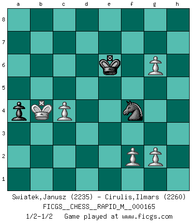 Last move : 1/2-1/2 2025 June 1 1:21:42 [Event "FICGS__CHESS__RAPID_M__000165"] [Site "FICGS"] [Date "2025.03.05"] [Round "1"] [White "Swiatek,Janusz"] [Black "Cirulis,Ilmars"] [Result "1/2-1/2"] [WhiteElo "2235"] [BlackElo "2260"] 1.e4 d6 2.d4 Nf6 3.Nc3 g6 4.Be3 Bg7 5.Qd2 a6 6.Bh6 Bxh6 7.Qxh6 e5 8.dxe5 dxe5 9.Nf3 Qe7 10.Bc4 Nc6 11.O-O-O Bg4 12.Ng5 Bxd1 13.Bxf7+ Kd8 14.Rxd1+ Kc8 15.Bxg6 Kb8 16.Nd5 Nxd5 17.exd5 Qf6 18.Nf7 Ne7 19.d6 Nxg6 20.Nxh8 Qxh8 21.Qe3 Qd8 22.d7 c6 23.h4 b5 24.h5 Ne7 25.Qxe5+ Kb7 26.Re1 Nd5 27.Qg7 Qc7 28.Re8 Rd8 29.Rxd8 Qxd8 30.Qxh7 Qg5+ 31.Kb1 Kc7 32.Qg6 Qxg6 33.hxg6 Kxd7 34.c4 Nf6 35.Kc2 Ke6 36.cxb5 axb5 37.Kd3 c5 38.b3 Nd5 39.a4 c4+ 40.bxc4 Nf4+ 41.Kc3 bxa4 42.Kb4 1/2-1/2 Follow this game move after move (download)Alekhine is a poet who creates a work of art out of something that would hardly inspire another man to send home a picture post card. (Max Euwe) Rauchen ist dem Schachspieler bei seiner Arbeit, also im Wettkampf, untersagt. (Viktor Kortschnoi) El Ajedrez es imaginación. (David Bronstein) Seul un grand joueur sait à quel point il joue faiblement. (Xavier Tartacover) Life doesn't imitate art, it imitates bad television. (Woody Allen)