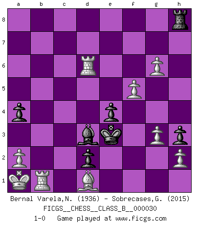 Last move : 1-0 2008 June 7 0:1:4 [Event "FICGS__CHESS__CLASS_B__000030"] [Site "FICGS"] [Date "2007.09.30"] [Round "1"] [White "Bernal Varela,Nelson"] [Black "Sobrecases,Guy"] [Result "1-0"] [WhiteElo "1936"] [BlackElo "2015"] 1.e4 c5 2.Nf3 Nc6 3.d4 cxd4 4.Nxd4 Nf6 5.Nc3 e5 6.Ndb5 d6 7.Bg5 a6 8.Na3 b5 9.Nd5 Be7 10.Bxf6 Bxf6 11.c3 Ne7 12.Nxf6+ gxf6 13.Bd3 Bb7 14.Nc2 d5 15.f3 Qb6 16.Qe2 h5 17.O-O-O h4 18.Rd2 O-O-O 19.Rhd1 Kb8 20.Qe1 f5 21.exf5 f6 22.Kb1 Rdg8 23.Ne3 b4 24.Rc2 a5 25.Ng4 h3 26.g3 e4 27.Be2 d4 28.Bc4 bxc3 29.Ka1 Rxg4 30.fxg4 Qb4 31.Be6 cxb2+ 32.Rxb2 Qxe1 33.Rxe1 Kc7 34.Rc2+ Kd6 35.Rc4 d3 36.Rd4+ Kc5 37.Rd7 Bc6 38.Rc1+ Kb6 39.Rxe7 d2 40.Rb1+ Kc5 41.Bb3 Kd4 42.Re6 a4 43.Bd1 Bd5 44.Rxf6 Bc4 45.Rd6+ Ke3 46.g5 Bd3 47.g6 1-0 Sicilian : Pelikan (Lasker/Sveshnikov) variation Queenside Castling by player White (move 17) Queenside Castling by player Black (move 18) Player White won this chess game. Follow this game move after move (download)Chess is a more highly symbolic game, but the aggressions are therefore even more frankly represented in the play. It probably began as a war game; that is, the representation of a miniature battle between the forces of two kingdoms. (Karl Meninger) Sie bekommen vielleicht den Eindruck, dass die Spitzenspieler überhaupt gar nicht so stark sind. Aber das stimmt nicht. Es ist eine Illusion. Mit einem Computer an der Seite ist es sehr leicht, Urteile zu fällen, aber wenn man alleine am Brett sitzt, sieht die Sache ganz anders aus. (Vladimir Kramnik) El ganar no lo es todo... pero el perder es nada. (Mednis) On croit qu'il y a plus de mauvais joueurs que de bons joueurs, c'est faux : Il y a autant de joueurs qui gagnent que de joueurs qui perdent. (Philippe Geluck) O divine art of subtlety and secrecy! Through you we learn to be invisible, through you inaudible and hence we can hold the enemy's fate in our hands. (Sun Tzu)
