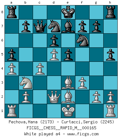 Last move : 1-0 2025 June 27 1:44:11 [Event "FICGS__CHESS__RAPID_M__000165"] [Site "FICGS"] [Date "2025.03.05"] [Round "1"] [White "Pechova,Hana"] [Black "Curtacci,Sergio"] [Result "1-0"] [WhiteElo "2173"] [BlackElo "2245"] 1.e4 c5 2.Nf3 d6 3.d4 cxd4 4.Nxd4 Nf6 5.Nc3 a6 6.Be3 e5 7.Nb3 Be6 8.f3 h5 9.Qd2 Be7 10.Be2 Nbd7 11.Nd5 Bxd5 12.exd5 Qc7 13.c4 a5 14.a4 1-0 This chess game has been lost on time (started : 2025.03.05 21:4:2) Follow this game move after move (download)Methodical thinking is of more use in Chess than inspiration. (C. J. S. Purdy) Schon mancher Spieler hat aufgegeben, um zu vermeiden, daß er eine Figur verliert. (Savielly Grigorievitsch Tartakower) Con el fin de mejorar tu juego, debes de estudiar los finales antes que todo, ya que mientras que los finales pueden ser estudiados y dominados por sí mismos, el juegomedio y la apertura deben de ser estudiados en relación con los finales. (José Raúl Capablanca) 'L'échange des dames est un coup dur pour les deux adversaires...' Un journaliste lors d'une partie du match Spassky-Fischer I would love to change the world, but they won't give me the source code. (Unknown)