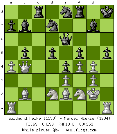 Last move : 0-1 2025 June 26 5:6:32 [Event "FICGS__CHESS__RAPID_E__000253"] [Site "FICGS"] [Date "2025.03.06"] [Round "1"] [White "Goldmund,Heike"] [Black "Marcel,Alexis"] [Result "0-1"] [WhiteElo "1599"] [BlackElo "1294"] 1.b4 f5 2.Bb2 Nf6 3.e3 g6 4.c4 Bg7 5.Nf3 O-O 6.Qb3 Kh8 7.Be2 d6 8.O-O Nbd7 9.d4 Qe8 10.Nbd2 e5 11.Rfe1 e4 12.Ng5 h6 13.Nh3 g5 14.f4 g4 15.Nf2 h5 16.c5 d5 17.g3 c6 18.a4 b6 19.b5 Bb7 20.Kg2 Qe6 21.Rh1 bxc5 22.dxc5 Nxc5 23.Qc3 Ncd7 24.h3 Rac8 25.hxg4 cxb5 26.Qd4 Ne8 27.Qb4 Bxb2 28.Qxb2+ Qf6 29.Qxb5 Bc6 30.Rxh5+ Kg7 31.Qa6 Ra8 32.Rah1 Rg8 33.Rg5+ Kf8 34.Rxf5 Nb8 35.Rxf6+ Nxf6 36.Qc8+ Kg7 37.Qc7+ Nfd7 38.Qd6 Rh8 39.Qe7+ Kg8 40.Qe6+ Kg7 41.Qe7+ Kg8 42.Rxh8+ Kxh8 43.Qf8+ Nxf8 44.Nh3 d4 45.exd4 e3 46.Kf1 exd2 47.Bd1 Nbd7 48.Ke2 a5 49.Kxd2 Ne6 50.f5 Nxd4 51.Kd3 Nf3 52.Ke3 Re8+ 0-1 This chess game has been lost on time (started : 2025.03.06 21:28:17) Follow this game move after move (download)Chess is a beautiful mistress. (Bent Larsen) Woher wissen wir, daß der Neanderthaler Blindschach gespielt hat? -- Bei Ausgrabungen wurden keine Schachbretter und Figuren gefunden. (Anonymous) Un buen jugador siempre tiene buena suerte. (José Raúl Capablanca) Les ravages du H expliquent la différence de niveau entre Tal et Thal [Abergel]. Difficult things take a long time, impossible things a little longer. (Author unknown)