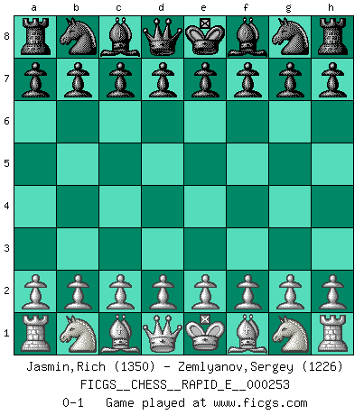 Last move : 0-1 2025 April 6 2:56:2 [Event "FICGS__CHESS__RAPID_E__000253"] [Site "FICGS"] [Date "2025.03.06"] [Round "1"] [White "Jasmin,Rich"] [Black "Zemlyanov,Sergey"] [Result "0-1"] [WhiteElo "1350"] [BlackElo "1226"] 0-1 This chess game has been lost on time (started : 2025.03.06 21:28:17) Follow this game move after move (download)When you see a good move, look for a better one. (Emanuel Lasker) Versuche, dich von der Sklaverei der Eröffnungsvarianten zu befreien. Stattdessen soll man gewisse Typenpositionen erlernen, die man eingehend analysiert. (Aaron Nimzowitsch) El jugador táctico sabe que hacer cuando hay algo que hacer; mientras que el estratega sabe que hacer cuando no hay nada que hacer. (Gerald Abrahams) La vie et les Echecs sont tous les deux une lutte constante. (Lasker) Train yourself to let go of everything you fear to lose. (Master Yoda in Star Wars ep.3)