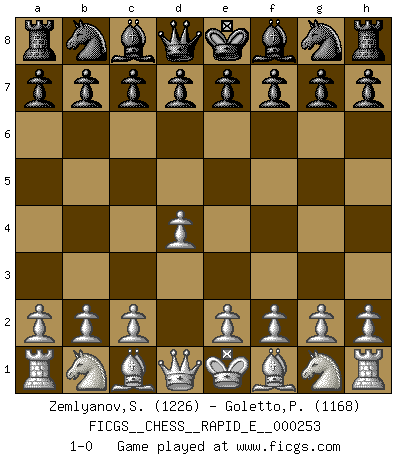 Last move : 1-0 2025 April 7 4:26:33 [Event "FICGS__CHESS__RAPID_E__000253"] [Site "FICGS"] [Date "2025.03.06"] [Round "1"] [White "Zemlyanov,Sergey"] [Black "Goletto,Piero Giuseppe"] [Result "1-0"] [WhiteElo "1226"] [BlackElo "1168"] 1.d4 1-0 This chess game has been lost on time (started : 2025.03.06 21:28:17) Follow this game move after move (download)The King is a fighting piece. Use it ! (Wilhelm Steinitz) Der zweitbeste Zug ist oft der einzig richtige. (Savielly Grigorievitsch Tartakower) Yo no creo en la psicología. Yo creo en las buenas movidas. (Bobby Fischer) Seul un grand joueur sait à quel point il joue faiblement. (Xavier Tartacover) Man is reluctant to give credit for intelligence to anyone, except his enemies. (Albert Einstein)