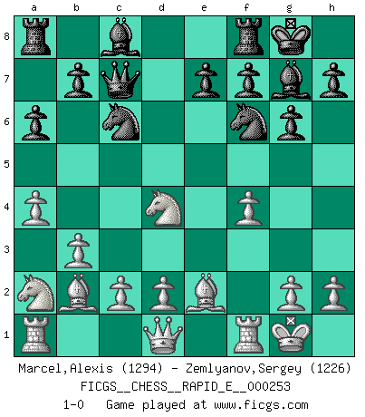 Last move : 1-0 2025 April 22 0:30:30 [Event "FICGS__CHESS__RAPID_E__000253"] [Site "FICGS"] [Date "2025.03.06"] [Round "1"] [White "Marcel,Alexis"] [Black "Zemlyanov,Sergey"] [Result "1-0"] [WhiteElo "1294"] [BlackElo "1226"] 1.f4 Nf6 2.Nf3 d5 3.e3 g6 4.b3 Bg7 5.Bb2 O-O 6.Be2 c5 7.O-O Qc7 8.Nc3 a6 9.a4 d4 10.Na2 Nc6 11.exd4 cxd4 12.Nxd4 1-0 This chess game has been lost on time (started : 2025.03.06 21:28:17) Follow this game move after move (download)Discovered check is the dive bomber of the Chessboard. (Reuben Fine) Es war undenkbar für die Behörden, dass ein sowjetischer Großmeister auf diese Art und Weise [Fischer-Taimanov 6:0] verliert, ohne dass es eine politischer Erklärung dafür gäbe. (Mark Taimanov) El Ajedrez es un juego terrible. Si no dominas el centro, tu oponente tiene una posición mas libre. Si tu tienes el centro, entonces realmente tienes algo de que preocuparte. (Siegbert Tarrasch) Celui qui prend des risques peut perdre, celui qui n'en prend pas perd toujours. (Xavier Tartacover) You must have a dream in order to have it come true. (A.P.J. Kalam)
