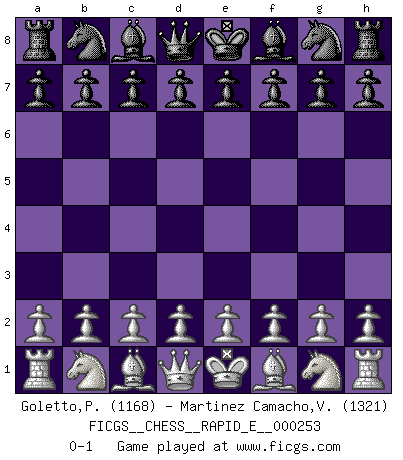 Last move : 0-1 2025 April 6 2:56:2 [Event "FICGS__CHESS__RAPID_E__000253"] [Site "FICGS"] [Date "2025.03.06"] [Round "1"] [White "Goletto,Piero Giuseppe"] [Black "Martinez Camacho,Victor Hugo"] [Result "0-1"] [WhiteElo "1168"] [BlackElo "1321"] 0-1 This chess game has been lost on time (started : 2025.03.06 21:28:17) Follow this game move after move (download)Chess is a terrible game. If you have no center, your opponent has a freer position. If you do have a center, then you really have something to worry about ! (Siegbert Tarrasch) Es hat in meinem Leben Zeiten gegeben, da ich sehr nahe daran war zu glauben, daß ich auch nicht eine einzige Schachpartie verlieren könnte. (José Raúl Capablanca) Yo adoro todas la posiciones. Denme una partida posicional difícil, y la jugaré. Pero posiciones totalmente ganadas, no las tolero. (Hein Donner) Dans le domaine de la peinture, de la gravure et de la sculpture, dès la première décennie de notre siècle, les artistes abandonnent la représentation de la partie d'échecs pour se concentrer sur les pièces, sur les échiquiers et sur toutes les variations auxquelles les unes et les autres peuvent donner lieu. On passe en quelque sorte d'un thème social à un thème musical (au sens de la musica médiévale, c'est-à-dire d'une notion qui inclue le rythme, l'harmonie, la construction et la déconstruction, etc.). Graphiquement et picturalement, l'échiquier apparaît comme une structure ouverte, dynamique, d'une richesse infinie, autorisant toutes les combinatoires et débouchant sur des mouvements et des rythmes de nature exponentielle. (Michel Pastoureau) The question of whether computers can think is just like question of whether submarines can swim. (Edsger W. Dijkstra)