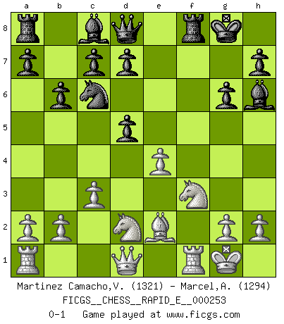 Last move : 0-1 2025 May 4 4:17:58 [Event "FICGS__CHESS__RAPID_E__000253"] [Site "FICGS"] [Date "2025.03.06"] [Round "1"] [White "Martinez Camacho,Victor Hugo"] [Black "Marcel,Alexis"] [Result "0-1"] [WhiteElo "1321"] [BlackElo "1294"] 1.e4 g6 2.d4 Bg7 3.Nf3 e6 4.Be2 Ne7 5.Be3 O-O 6.O-O f5 7.exf5 Nxf5 8.c3 Nxe3 9.fxe3 Nc6 10.Nbd2 Bh6 11.e4 b6 12.d5 exd5 0-1 This chess game has been lost on time (started : 2025.03.06 21:28:17) Follow this game move after move (download)A bad plan is better than none at all. (Frank Marshall) Schach ist wie eine schöne Frau, zu der wir ständig zurückkehren, gleichviel, wie oft sie uns zurückweist. (Anonymous) Aquel que teme a un Peón de Reina aislado, debería de retirarse del Ajedrez. (Siegbert Tarrasch) 'L'échange des dames est un coup dur pour les deux adversaires...' Un journaliste lors d'une partie du match Spassky-Fischer Indecision is the key to flexibility. (Unknown)