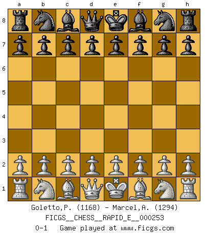 Last move : 0-1 2025 April 6 2:56:2 [Event "FICGS__CHESS__RAPID_E__000253"] [Site "FICGS"] [Date "2025.03.06"] [Round "1"] [White "Goletto,Piero Giuseppe"] [Black "Marcel,Alexis"] [Result "0-1"] [WhiteElo "1168"] [BlackElo "1294"] 0-1 This chess game has been lost on time (started : 2025.03.06 21:28:17) Follow this game move after move (download)You sit at the board and suddenly your heart leaps. Your hand trembles to pick up the piece and move it. But what Chess teaches you is that you must sit there calmly and think about whether it's really a good idea and whether there are other better ideas. (Stanley Kubrick) Moralische Siege zählen nicht. (Savielly Grigorievitsch Tartakower) Desconfianza es la característica mas necesaria de un jugador de Ajedrez. (Siegbert Tarrasch) Les Echecs, c'est l'art de la guerre sans les charniers, c'est la résurrection des morts tombés au champ d'honneur, l'espoir perpétuel, la suprématie de l'intelligence sur la force, la culture de l'esprit. (F. Szpiner) You can only get smarter by playing a smarter opponent. (Revolver, movie)