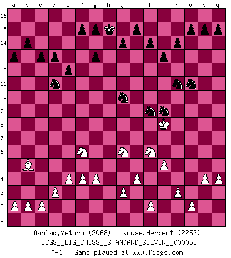 Last move : 0-1 2025 April 19 21:12:35 [Event "FICGS__BIG_CHESS__STANDARD_SILVER__000052"] [Site "FICGS"] [Date "2025.03.13"] [Round "2"] [White "Aahlad,Yeturu"] [Black "Kruse,Herbert"] [Result "0-1"] [WhiteElo "2068"] [BlackElo "2257"] 1.m2-m4 j15-k13 2.p1-o3 h16-o10 3.h2-g4 m15-m13 4.e2-e4 l16-p12 5.k1-h2 e15-e13 6.l1-p5 p16-o14 7.n2-n3 n15-n14 8.f1-b5 g16-j15 9.o1-f9 b16-c14 10.j2-k4 f16-b12 11.d2-d3 o16-f8 12.c1-l9 d15-d14 13.h2-j4 c16-l8 14.m4-m5 o10-c10 15.b1-c3 l8-g4 16.h3-g4 c10-j4 17.h1-h3 j4-g4 18.e1-e3 g4-h3 19.e3-h3 m16-m14 20.m1-m4 m14-l14 21.q1-m1 h15-j13 22.m4-l4 k16-h15 23.m1-m4 e16-f16 24.g1-f3 j13-k11 25.l9-k10 l14-l4 26.m4-l4 l15-l14 27.a1-h1 h15-j13 28.f3-g5 f8-g7 29.g5-j6 g7-k10 30.p5-k10 e13-e12 31.h3-h7 a16-e16 32.l4-l7 e16-e13 33.k10-g7 a15-a13 34.h1-h6 j13-g14 35.k4-l6 k11-h12 36.o3-n5 e13-g13 37.q2-q4 b12-g7 38.h7-g7 g13-g7 39.l7-g7 j16-h15 40.c3-d5 f16-e16 41.h6-b6 c14-b12 42.j6-k8 b15-b14 43.g7-c7 c15-c13 44.c7-d7 d14-d13 45.f2-f4 e16-e13 46.d7-g7 q16-e16 47.g2-g4 e13-j13 48.f9-j6 p12-j6 49.b6-j6 j13-j6 50.k8-j6 o14-p12 51.p2-p4 e16-e13 52.k2-k4 e13-g13 53.g7-g13 h14-g13 54.n5-o7 k13-l11 55.j1-k2 j15-k13 56.k2-l3 h12-j10 57.l3-m4 g14-h12 58.m4-n5 j10-l9 59.n5-n6 h12-j10 60.n6-n7 l11-m9 61.n7-m8 p12-n11 62.o7-n9 k13-l11 63.d5-f6 l11-k9 64.m8-l8 k9-m10 65.l8-m8 b12-d11 66.n9-o11 m10-o11 0-1 Follow this game move after move (download)Pawn endings are to Chess what putting is to golf. (Cecil Purdy) Ohne Fehler kann es keine Brillanz geben. (Emanuel Lasker) Después de una mala apertura, hay una esperanza en el juego medio. Pero una vez que estas en finales, el momento de la verdad ha llegado. (Edmar Mednis) Il n'y a plus de joueurs du niveau de Jacob Murray dont la seule quête est le beau jeu, le plaisir de voir les pièces construire quelque chose. Sur 10 idées à la minute, 9 seront sans intérêt, la dernière s'avèrera géniale. (Christian Bauer) Nobody is always a winner, and anybody who says he is, is either a liar or doesn't play poker. (Amarillo Slim)