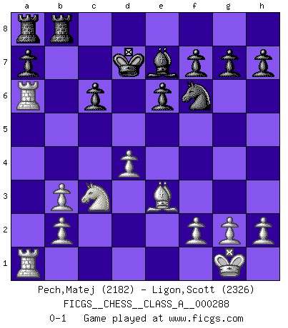 Last move : 0-1 2025 July 18 20:56:29 [Event "FICGS__CHESS__CLASS_A__000288"] [Site "FICGS"] [Date "2025.03.17"] [Round "1"] [White "Pech,Matej"] [Black "Ligon,Scott"] [Result "0-1"] [WhiteElo "2182"] [BlackElo "2326"] 1.e4 c5 2.Nf3 d6 3.Bb5+ Bd7 4.Bxd7+ Qxd7 5.O-O Nc6 6.c3 d5 7.exd5 Qxd5 8.d4 e6 9.Be3 cxd4 10.cxd4 Nf6 11.Nc3 Qa5 12.Qb3 Qb4 13.Ne5 Be7 14.Nxc6 Qxb3 15.axb3 bxc6 16.Ra6 Kd7 17.Rfa1 Rhb8 0-1 This chess game has been lost on time (started : 2025.03.17 13:34:44) Follow this game move after move (download)Fischer sacrificed virtually everything most of us weakies (to use his term) value, respect, and cherish, for the sake of an artful, often beautiful board game, for the ambivalent privilege of being its greatest master. (Paul Kollar) Mit sehr nachdenklichem Gesicht schreitet Bobby durch den Turniersaal. Was ist passiert?, fragt Lombardy. Ich stehe schlecht, antwortet Fischer. Lombardy: Dann biete doch einfach Remis an. Fischer: So schlecht stehe ich nun auch wieder nicht! (Robert James Fischer) No volvere nunca a jugar contigo. Has insultado a mi amigo. - cuando un oponente se maldijo por una mala jugada (Miguel Najdorf) Je menace de comprendre la position. (Anonyme) Only sick music makes money today. (Friedrich Nietzsche)