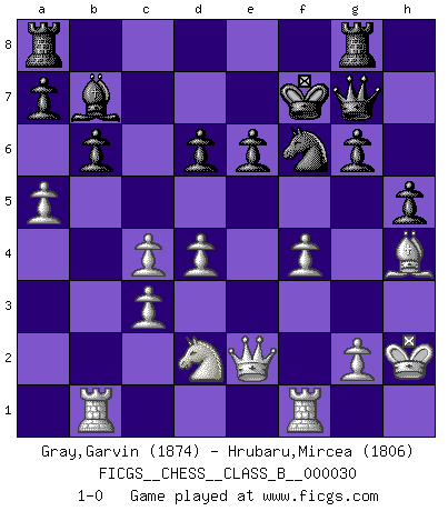 Last move : 1-0 2008 March 13 23:52:9 [Event "FICGS__CHESS__CLASS_B__000030"] [Site "FICGS"] [Date "2007.09.30"] [Round "1"] [White "Gray,Garvin"] [Black "Hrubaru,Mircea"] [Result "1-0"] [WhiteElo "1874"] [BlackElo "1806"] 1.d4 Nf6 2.c4 e6 3.Nc3 Bb4 4.Nf3 b6 5.Bg5 Bb7 6.e3 h6 7.Bh4 c5 8.a3 Bxc3+ 9.bxc3 d6 10.Bd3 Nbd7 11.O-O Qe7 12.Nd2 g5 13.Bg3 h5 14.h4 Rg8 15.f3 gxh4 16.Bxh4 Qf8 17.Qe2 Qh6 18.Kh2 Nf8 19.a4 Qg7 20.a5 Ng6 21.Bxg6 fxg6 22.f4 Kf7 23.Rab1 cxd4 24.exd4 1-0 Nimzo-Indian : Three knights variation Kingside Castling by player White (move 11) Player White won this chess game. Follow this game move after move (download)When you are lonely, when you feel yourself an alien in the world, play Chess. This will raise your spirits and be your counselor in war. (Aristotle) Dein Körper muss in Topform sein. Dein Schach verfällt, wenn dein Körper verfällt. Der Körper kann nicht vom Geist getrennt werden. (Robert James Fischer) Tu no necesitas jugar muy bien, únicamente ayudar a tu oponenet a que juegue muy mal. (Genrikh Chepukaitis) Plusieurs personnes se sont demandées comment Tal faisait pour gagner... En fait, c'est très simple ! Il met ses pièces au centre de l'échiquier et les sacrifie quelque part ! (David Bronstein) The difference between stupidity and genius is that genius has its limits. (Murphy)