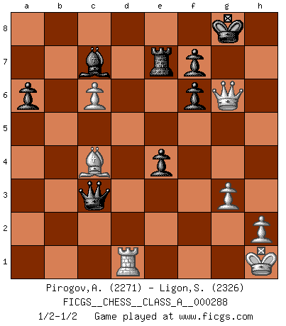 Last move : 1/2-1/2 2025 July 20 18:18:41 [Event "FICGS__CHESS__CLASS_A__000288"] [Site "FICGS"] [Date "2025.03.17"] [Round "1"] [White "Pirogov,Andrey Mikhaylovich"] [Black "Ligon,Scott"] [Result "1/2-1/2"] [WhiteElo "2271"] [BlackElo "2326"] 1.e4 c5 2.Nf3 d6 3.d4 cxd4 4.Nxd4 Nf6 5.Nc3 a6 6.f3 e5 7.Nb3 Be6 8.Be3 Be7 9.Qd2 h5 10.Be2 Nbd7 11.Nd5 Bxd5 12.exd5 Qc7 13.Na5 O-O 14.c4 e4 15.O-O Ne5 16.Bd4 Rae8 17.Rac1 Qd7 18.b4 Bd8 19.f4 Neg4 20.Qb2 Nh6 21.c5 Nf5 22.c6 bxc6 23.dxc6 Qc7 24.a4 Nd5 25.Kh1 Nxb4 26.Qxb4 Nxd4 27.Qxd4 Qxa5 28.Qxd6 Bc7 29.Qc5 Qxa4 30.g3 Rd8 31.Rc4 Qa2 32.Qxh5 Rfe8 33.f5 Rd6 34.f6 Rxf6 35.Rxf6 gxf6 36.Rd4 Re7 37.Bc4 Qa1+ 38.Rd1 Qc3 39.Qg6+ 1/2-1/2 Follow this game move after move (download)I won't play with you anymore. You have insulted my friend. - When an opponent cursed himself for a blunder. (Miguel Najdorf) Ja, ich habe einmal eine Blitzpartie gespielt, es war in einem Zug, 1929. --im Interview 1989 (Mikhail Moiseyevich Botvinik) Dejen al perfeccionista jugar por correo. (Yasser Seirawan) Echiquier : carré parfait, comme la Jérusalem nouvelle décrite par l'auteur de l'Apocalypse, huit cases sur huit, exaltation du chiffre 4, symbole du cosmos aux quatre horizons... où le noir et le blanc, l'ombre et la lumière, le mal et le bien s'entremêlent et se conjuguent. (Robert Couffignal, Le Gambit du poète) The best teachers teach from the heart, not from the book. (Author unknown)