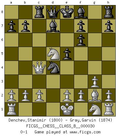 Last move : 0-1 2007 November 26 9:7:9 [Event "FICGS__CHESS__CLASS_B__000030"] [Site "FICGS"] [Date "2007.09.30"] [Round "1"] [White "Denchev,Stanimir"] [Black "Gray,Garvin"] [Result "0-1"] [WhiteElo "1800"] [BlackElo "1874"] 1.d4 Nf6 2.Nc3 d5 3.g3 c5 4.Bg2 cxd4 5.Qxd4 Nc6 6.Qa4 e5 7.Bg5 Bd7 8.Nxd5 Nd4 9.Bxf6 gxf6 10.Qc4 Rc8 0-1 Queen's pawn game Player Black won this chess game. Follow this game move after move (download)Chess is ruthless: you've got to be prepared to kill people. (Nigel Short) Wer der Ansicht ist, daß alle Schachspieler verrückt sind, wird durch Studium des Lebens von Emil Josef Diemer nicht auf andere Gedanken kommen. (Hans Ree) El Ajedrez es un invernadero donde los frutos del carácter pueden madurar mas completamente que en la vida. (Edward Morgan Foster) Les échecs sont un jeu terrible. Si vous n'avez pas le centre, votre adversaire a une position plus libre. Par contre, si vous avez le centre, alors vous avez vraiment quelque chose pour laquelle vous inquiéter ! (Siegbert Tarrasch) Warrior pose battles inner weakness and wins focus. You see that there is no war within you. You're on your own side, and you are your own strength. (Terri Guillemets)
