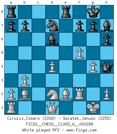 Last move : 1/2-1/2 2025 May 17 12:51:52 [Event "FICGS__CHESS__CLASS_A__000288"] [Site "FICGS"] [Date "2025.03.17"] [Round "1"] [White "Cirulis,Ilmars"] [Black "Swiatek,Janusz"] [Result "1/2-1/2"] [WhiteElo "2268"] [BlackElo "2255"] 1.f4 d5 2.e3 Nf6 3.Nf3 Bf5 4.b3 e6 5.Be2 Be7 6.Bb2 O-O 7.O-O c5 8.Ne5 h6 9.c4 Nfd7 10.g4 Bh7 11.Nxd7 Nxd7 12.cxd5 exd5 13.f5 d4 14.exd4 Re8 15.dxc5 Bxc5+ 16.d4 Bd6 17.Nd2 Qh4 18.Rf2 Nf6 19.Nc4 Bc7 20.Rg2 Nd5 21.Ne5 Ne3 22.Qe1 Qd8 23.Qf2 Nxg2 24.Qxg2 b5 25.Bf3 Rc8 26.Bd5 Bxe5 27.dxe5 Qb6+ 28.Kf1 Re7 1/2-1/2 Follow this game move after move (download)Good positions don't win games, good moves do. (Gerald Abrahams) Ein guter Spieler hat immer Glück. (José Raúl Capablanca) Tu sabes, camarada Pachman, no disfruto el ser un Ministro, preferería jugar al Ajedrez como tu. (Che Guevara) En blitz, le Cavalier l'emporte sur le Fou. (Vlastimil Hort) The modern world has divided itself into Conservatives and Progressives. The business of Progressives is to go on making mistakes. The business of the Conservatives is to prevent the mistakes from being corrected. (G.K. Chesterton)