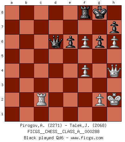 Last move : 1/2-1/2 2025 September 24 0:14:38 [Event "FICGS__CHESS__CLASS_A__000288"] [Site "FICGS"] [Date "2025.03.17"] [Round "1"] [White "Pirogov,Andrey Mikhaylovich"] [Black "Talek,Jan"] [Result "1/2-1/2"] [WhiteElo "2271"] [BlackElo "2068"] 1.d4 e6 2.e4 d5 3.Nc3 Nf6 4.e5 Nfd7 5.f4 c5 6.Nf3 Nc6 7.Be3 a6 8.Qd2 Be7 9.a3 O-O 10.h4 b5 11.Bd3 cxd4 12.Nxd4 Nxd4 13.Bxd4 b4 14.axb4 Bxb4 15.h5 a5 16.h6 g6 17.O-O Ba6 18.Bxa6 Rxa6 19.Qe2 Ra8 20.Nb5 a4 21.Bf2 Bc5 22.c4 dxc4 23.Bxc5 Nxc5 24.Qxc4 Qb6 25.Kh2 Ne4 26.Qxe4 Qxb5 27.Rf2 Qd7 28.Rc2 Qe7 29.Qe1 a3 30.bxa3 Rxa3 31.Rxa3 Qxa3 32.Qh4 f6 33.exf6 Qd6 34.Re2 Kf7 35.Qg5 Qd8 36.f5 Qd6+ 37.g3 exf5 38.Re7+ Kg8 39.Rg7+ Kh8 40.f7 Qd4 41.Qc1 f4 42.Qxf4 Qxg7 43.hxg7+ Kxg7 44.Kh3 1/2-1/2 Follow this game move after move (download)To avoid losing a piece, many a person has lost the game. (Savielly Tartakover) Du musst Deinen Gegner in einen tiefen dunklen Wald führen wo 2+2=5 ist und wo der Weg, der wieder hinausführt, nur breit genug für einen ist. (Mikhail Nekhemyevich Tal) El Ajedrez es como la guerra en un tablero. (Bobby Fischer) Des combinaisons [dans le jeu d'échecs] pareilles à des mélodies. Je crois entendre pour ainsi dire la musique des coups... (Vladimir Nabokov) There is a very easy way to return from a casino with a small fortune : go there with a large one. (Jack Yelton)