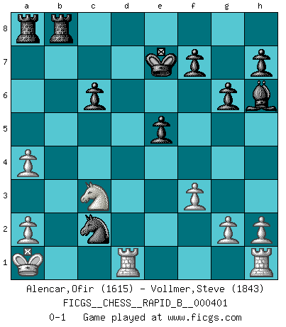 Last move : 0-1 2025 May 31 1:46:23 [Event "FICGS__CHESS__RAPID_B__000401"] [Site "FICGS"] [Date "2025.03.18"] [Round "1"] [White "Alencar,Ofir"] [Black "Vollmer,Steve"] [Result "0-1"] [WhiteElo "1615"] [BlackElo "1843"] 1.d4 Nf6 2.d5 c6 3.dxc6 bxc6 4.Nc3 g6 5.e4 d6 6.e5 Ng4 7.exd6 Qxd6 8.Qxd6 exd6 9.f3 Ne5 10.Ne4 Be6 11.Bf4 Nbd7 12.Bxe5 dxe5 13.O-O-O Bh6+ 14.Kb1 Ke7 15.b3 Rhb8 16.Nd2 a5 17.Nc4 Bxc4 18.Bxc4 Nb6 19.Ka1 a4 20.bxa4 Nxc4 21.Ne2 Na3 22.Nc3 Nxc2+ 0-1 Follow this game move after move (download)Before the endgame, the Gods have placed the middle game. (Siegbert Tarrasch) Die jungen Leute sollen verstehen, dass sie noch etwas von mir lernen können und müssen. (Viktor Kortschnoi) En manos de Fischer's, una diminuta ventaja teórica es tan buena como tener una Reina de ventaja. (Isaac Kashdan) Le jeu d'échecs est comme rejeté hors du temps. (Antoine de Saint-Exupéry) If you know the enemy and know yourself you need not fear the results of a hundred battles. (Sun Tzu)