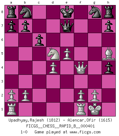 Last move : 1-0 2025 June 11 12:13:28 [Event "FICGS__CHESS__RAPID_B__000401"] [Site "FICGS"] [Date "2025.03.18"] [Round "1"] [White "Upadhyay,Rajesh"] [Black "Alencar,Ofir"] [Result "1-0"] [WhiteElo "1812"] [BlackElo "1615"] 1.c4 d5 2.cxd5 e6 3.Nc3 exd5 4.d4 Bb4 5.Bf4 Bd6 6.Nxd5 Bxf4 7.Nxf4 c6 8.Nf3 f6 9.e4 Bg4 10.Be2 Bxf3 11.Bxf3 Qe7 12.O-O g5 13.Nh5 Nh6 14.e5 f5 15.Qd2 f4 16.Nf6+ Kf7 17.h4 gxh4 18.Qxf4 Ng8 19.Nd5 Ke8 20.Bh5+ 1-0 Follow this game move after move (download)I give 98 percent of my mental energy to Chess. Others give only 2 percent. (Bobby Fischer) Wie bekannt hörte Morphy 1859 auf, Schach zu spielen. Seine Enttäuschung galt nicht so sehr dem Schach, wie den Schachspielern. (Robert James Fischer) Debemos de asegurarnos de que el Ajedrez no se convierta en un lenguaje muerto, muy interesante, pero tan solo para un grupo muy pequeño. (Sytze Faber) La conception d'un plan est le processus par lequel un joueur exploite les avantages de sa position tout en s'efforçant d'en réduire au minimum les inconvénients. Afin de garantir le succès, un plan doit toujours se fonder sur un diagnostic objectif des particularités d'une position. La conception d'un plan est d'autant plus difficile que la position est équilibrée, et grandement facilitée lorsqu'il n'existe qu'un seul plan susceptible de répondre aux exigences de la position. (Harry Golombek) If you have any trouble condescending, find a Unix user to show you how it's done. (Scott Adams)