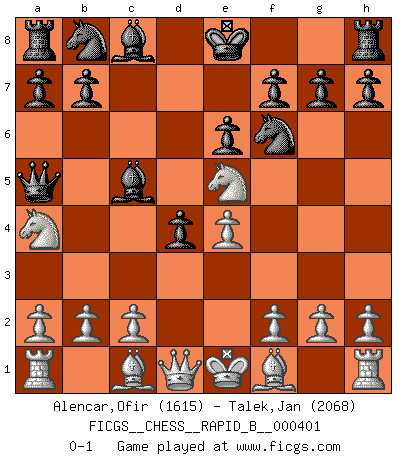 Last move : 0-1 2025 April 18 14:31:37 [Event "FICGS__CHESS__RAPID_B__000401"] [Site "FICGS"] [Date "2025.03.18"] [Round "1"] [White "Alencar,Ofir"] [Black "Talek,Jan"] [Result "0-1"] [WhiteElo "1615"] [BlackElo "2068"] 1.d4 d5 2.Nf3 e6 3.Ne5 Nf6 4.Nc3 c5 5.dxc5 Bxc5 6.e4 d4 7.Na4 Qa5+ 0-1 Follow this game move after move (download)There must have been a time when men were demigods, or they could not have invented Chess. (Gustav Schenk) Der beste Spieler in einem Turnier gewinnt es nie. Er landet auf Platz zwei oder drei. (Siegbert Tarrasch) Buenas posiciones no logran ganar juegos, buenas movidas sí. (Gerald Abrahams) Vous m'avez demandé de vous exposer quel est le fondement de la prière. Je ne fais que préparer les pièces du jeu sur la table... Nous sera-t-il permis d'en adopter les règles et si nous les appliquons scrupuleusement nous ne tarderons pas à faire mat le Roi divin ! Il ne pourra échapper à nos mains. (Sainte Thérèse d'Avila, Chemin de perfection) To steal ideas from one person is plagiarism. To steal from many is research. (Unknown)
