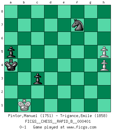 Last move : 0-1 2025 May 31 2:29:43 [Event "FICGS__CHESS__RAPID_B__000401"] [Site "FICGS"] [Date "2025.03.18"] [Round "1"] [White "Pintor,Manuel"] [Black "Trigance,Emile"] [Result "0-1"] [WhiteElo "1751"] [BlackElo "1858"] 1.e4 e5 2.f4 exf4 3.Nf3 g5 4.Bc4 g4 5.O-O gxf3 6.Qxf3 Qf6 7.c3 Nc6 8.d4 Nxd4 9.Bxf7+ Qxf7 10.cxd4 Bh6 11.Nc3 d6 12.Nd5 Be6 13.Bxf4 Bxf4 14.Nxf4 O-O-O 15.Qg3 Bc4 16.Rf2 Nf6 17.b3 Be6 18.Nxe6 Qxe6 19.Qg7 Nh5 20.Qf7 Qxf7 21.Rxf7 Rdf8 22.Raf1 Rxf7 23.Rxf7 Re8 24.Rxh7 Nf6 25.Rh6 Nxe4 26.g4 Ng5 27.Kf2 Rf8+ 28.Ke3 Rf3+ 29.Ke2 Rh3 30.Rh5 Rxh5 31.gxh5 Kd8 32.Ke3 Ke7 33.Kf4 Kf6 34.h4 Nf7 35.d5 c6 36.dxc6 bxc6 37.b4 c5 38.bxc5 dxc5 39.Ke4 Ke6 40.a4 a5 41.Kd3 Kd5 42.Kc3 c4 43.Kc2 Kd4 44.Kd2 c3+ 45.Kc2 Kc4 46.Kc1 Kb3 47.Kb1 Kxa4 0-1 Follow this game move after move (download)When I have White, I win because I am white; When I have Black, I win because I am Bogolyubov. (Bogolyubov) Die Auseinandersetzung mit Karpow war politisch geprägt. Er stand für das kommunistische System, wurde von dessen Repräsentanten gehätschelt. Ich war der Oppositionelle. Jeder Schachweltmeister spiegelt auch die gesellschaftlichen Verhältnisse wider. Kramnik steht für die Börsen-Generation des Neuen Markts, ideologiefrei, zahlenfixiert. (Garry Kasparov) Yo he agregado estos principios a la ley: pongan los Caballos en acción antes de que los dos Alfiles sean desarrollados. (Emanuel Lasker) RxDa4 pat (...) You think that education is too expensive ? Try ignorance. (Derek Bok)