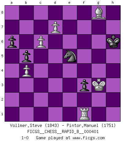 Last move : 1-0 2025 April 19 0:37:1 [Event "FICGS__CHESS__RAPID_B__000401"] [Site "FICGS"] [Date "2025.03.18"] [Round "1"] [White "Vollmer,Steve"] [Black "Pintor,Manuel"] [Result "1-0"] [WhiteElo "1843"] [BlackElo "1751"] 1.e4 e5 2.Nf3 Nc6 3.Bb5 Bc5 4.O-O Qf6 5.c3 Nge7 6.d3 h6 7.Nbd2 O-O 8.Nc4 d6 9.Ne3 Qg6 10.Kh1 Bg4 11.Nxg4 Qxg4 12.b4 Bb6 13.Bb2 a6 14.Bc4 Ng6 15.h3 Qh5 16.Ng1 Qh4 17.g3 Qe7 18.Kg2 Kh7 19.Qg4 Qg5 20.Qxg5 hxg5 21.Nf3 f6 22.a3 Nge7 23.d4 Kg6 24.Bd3 Rh8 25.d5 Nd8 26.c4 Nf7 27.Rac1 c5 28.Nd2 cxb4 29.axb4 Bc7 30.c5 b5 31.f4 gxf4 32.gxf4 exf4 33.e5 f5 34.exd6 Nxd5 35.Kh2 Ng5 36.Rf3 Nxf3+ 37.Nxf3 Bd8 38.Rg1+ Kh5 39.Bxf5 Bf6 40.Bxf6 Nxf6 41.c6 Rhg8 42.Bg6+ Kh6 43.Ne5 Rgf8 44.Nf7+ Rxf7 45.Bxf7 g5 46.d7 f3 47.Rf1 g4 48.hxg4 Nxg4+ 49.Kg3 Ne5 50.Bd5 Rg8+ 51.Bxg8 1-0 Follow this game move after move (download)A big shock; the best chess player in history has passed away. (Lajos Portisch, about Bobby Fischer's death) Aljechin war kein Nazi. Er war ein Opportunist. Ein schrecklicher Mann. Er liebte Geld über alles und würde für Geld ein Jude, ein Katolik oder ein Protestant werden. (Miguel Najdorf) Cuando veas una buena jugada, trata de encontrar otra mejor. (Emanuel Lasker) Pour se monter efficace, un Cavalier a besoin d'avant-postes ! Les Cavaliers font les meilleurs bloqueurs de pions passés. Life is pleasant. Death is peaceful. It's the transition that's troublesome. (Isaac Asimov)