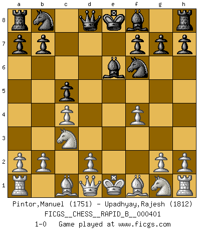 Last move : 1-0 2025 April 24 10:54:7 [Event "FICGS__CHESS__RAPID_B__000401"] [Site "FICGS"] [Date "2025.03.18"] [Round "1"] [White "Pintor,Manuel"] [Black "Upadhyay,Rajesh"] [Result "1-0"] [WhiteElo "1751"] [BlackElo "1812"] 1.e4 c5 2.f4 d5 3.exd5 Nf6 4.c4 e6 5.dxe6 Bxe6 6.Nc3 1-0 This chess game has been lost on time (started : 2025.03.18 5:0:49) Follow this game move after move (download)If cunning alone were needed to excel, women would be the best Chess players. (Albin) Ich weiss nicht was Gott gegen mich auf 1.e4 antworten würde. (Robert James Fischer) El Ajedrez es despiadado: debes de estar preparado para matar gente. (Nigel Short) Assurément je connaissais par expérience le mystérieux attrait de ce jeu royal, le seul entre tous les jeux inventés par les hommes qui échappe souverainement à la tyrannie du hasard, le seul où l'on ne doive sa victoire qu'à son intelligence ou plutôt à une certaine forme d'intelligence. Mais n'est-ce pas déjà le limiter injurieusement que d'appeler les échecs un jeu ? N'est-ce pas une science, un art ou quelque chose qui, comme le cercueil de Mahomet entre ciel et terre, est suspendu entre l'un et l'autre, et qui réunit un nombre incroyable de contraires ? [...] C'est une pensée qui ne mène à rien, une mathématique qui n'établit rien, un art qui ne laisse pas d'uvre, une architecture sans matière; et il l'a prouvé néanmoins qu'il était plus durable, à sa manière, que les livres ou que tout autre monument, ce jeu unique qui appartient à tous les peuples et à tous les temps, et dont personne ne sait quel dieu en fit don à la terre pour tuer l'ennui, pour aiguiser l'esprit et stimuler l'âme. Où commence-t-il, où finit-il ? (Stefan Zweig) The Internet is so big, so powerful and pointless that for some people it is a complete substitute for life. (Andrew Brown)