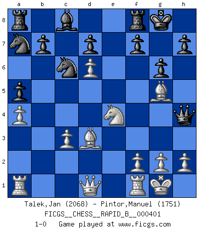 Last move : 1-0 2025 April 6 3:23:51 [Event "FICGS__CHESS__RAPID_B__000401"] [Site "FICGS"] [Date "2025.03.18"] [Round "1"] [White "Talek,Jan"] [Black "Pintor,Manuel"] [Result "1-0"] [WhiteElo "2068"] [BlackElo "1751"] 1.a4 e5 2.e4 Bc5 3.Nf3 Qf6 4.c3 a5 5.d4 exd4 6.cxd4 Bb4+ 7.Nc3 Nc6 8.Bb5 Nge7 9.O-O Bxc3 10.bxc3 O-O 11.e5 Qg6 12.d5 Na7 13.d6 cxd6 14.exd6 Nec6 15.Bd3 Qf6 16.Ng5 g6 17.Ne4 Qh4 18.Bg5 1-0 Follow this game move after move (download)My God, Bobby Fischer plays so simply. (Alexei Suetin) Ich habe kein Problem mit Frauen, sondern nur mit dem Niveau ihres Schachspiels (Judith Polgar) Si no le temes a Spassky, entonces elimino el elemento del dinero. (Jim Slater) Donnez-moi un Cavalier en 6e et je gagnerais toutes mes parties. (Steinitz) A specialist learns more and more about less and less until he knows everything about nothing. (Nicholas Murray Butler)