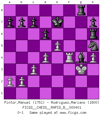 Last move : 0-1 2025 April 14 4:35:57 [Event "FICGS__CHESS__RAPID_B__000401"] [Site "FICGS"] [Date "2025.03.18"] [Round "1"] [White "Pintor,Manuel"] [Black "Rodriguez,Mariano"] [Result "0-1"] [WhiteElo "1751"] [BlackElo "1800"] 1.e4 e5 2.f4 exf4 3.Nf3 g5 4.Bc4 g4 5.O-O gxf3 6.Qxf3 Qf6 7.c3 d6 8.d4 Bh6 9.Bd2 Ne7 10.Qh5 Qg6 11.Qh4 Rg8 12.Rf2 Bg5 13.Bxf7+ Qxf7 14.Qg3 fxg3 15.Rxf7 gxh2+ 16.Kxh2 Kxf7 17.Bxg5 Rxg5 18.Nd2 Rg6 19.Rf1+ Ke8 20.Nf3 Bg4 21.Nh4 Rh6 22.g3 Ng6 23.Rf6 Nd7 24.Rf2 Nxh4 25.gxh4 Ke7 26.Kg3 Rg8 27.Rf4 Nf6 28.e5 Nh5+ 0-1 Follow this game move after move (download)The tactician knows what to do when there is something to do; whereas the strategian knows what to do when there is nothing to do. (Gerald Abrahams) Das Schachspiel übertrifft alle anderen Spiele so weit wie der Chimborasso einen Misthaufen. (Arthur Schopenhauer) Un sacrificio se refuta mucho mejor al aceptarlo. (Wilhelm Steinitz) Lorsque vous vous retrouvez devant une position atroce, ne tendez pas un ultime piège dérisoire avec l'intention d'abandonner si l'adversaire le déjoue ! Faites-vous plutôt un devoir de résister comme si votre vie en dépendait. Jouez le coup qui vous déplairait au centuple si vous étiez dans la peau de votre tortionnaire ! Is not life a hundred times too short to bore ourselves ? (Friedrich Nietzsche)