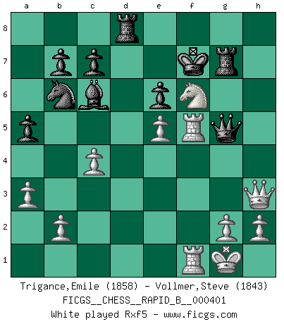 Last move : 0-1 2025 July 5 20:48:23 [Event "FICGS__CHESS__RAPID_B__000401"] [Site "FICGS"] [Date "2025.03.18"] [Round "1"] [White "Trigance,Emile"] [Black "Vollmer,Steve"] [Result "0-1"] [WhiteElo "1858"] [BlackElo "1843"] 1.e4 Nf6 2.e5 Nd5 3.d4 d6 4.c4 Nb6 5.f4 dxe5 6.fxe5 Nc6 7.Be3 e6 8.Nf3 Bb4+ 9.Nc3 O-O 10.Bd3 h6 11.O-O Be7 12.a3 a5 13.Qd2 f5 14.Bxh6 gxh6 15.Qxh6 Rf7 16.Rf2 Rg7 17.Ne2 Bg5 18.Nxg5 Qxg5 19.Qh3 Bd7 20.Nf4 Nxd4 21.Nh5 Bc6 22.Nf6+ Kf7 23.Raf1 Rd8 24.Bxf5 Nxf5 25.Rxf5 Qxg2+ 26.Qxg2 Rxg2+ 27.Kh1 exf5 0-1 Follow this game move after move (download)There's never before been a Chess player with such a thorough knowledge of the intricacies of the game and such an absolutely indomitable will to win. I think Bobby is the greatest player that ever lived. (Lisa Lane) Ich bin stolz ein Bulgare zu sein. (Veselin Topalov) Una buena memoria, concentración, imaginación y una fuerte voluntad, se requiere para llegar a ser un buen jugador. (Bobby Fischer) Psychologiquement, tu dois avoir confiance en toi même, mais cette confiance doit être basée sur des faits. (Robert Fischer) Excelling at chess has long been considered a symbol of more general intelligence. That is an incorrect assumption in my view, as pleasant as it might be. But for the purposes of argument and investigation, chess is, in Russkin-Gutman's words, 'an unparalleled laboratory, since both the learning process and the degree of ability obtained can be objectified and quantified, providing an excellent comparative framework on which to use rigorous analytical techniques.' (The Chess Master and the Computer, by Garry Kasparov - 2010)
