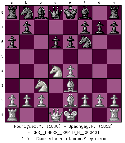 Last move : 1-0 2025 April 26 1:18:8 [Event "FICGS__CHESS__RAPID_B__000401"] [Site "FICGS"] [Date "2025.03.18"] [Round "1"] [White "Rodriguez,Mariano"] [Black "Upadhyay,Rajesh"] [Result "1-0"] [WhiteElo "1800"] [BlackElo "1812"] 1.e4 c5 2.Nf3 d6 3.d4 cxd4 4.Nxd4 Nf6 5.Nc3 a6 6.Be2 e6 7.Be3 1-0 This chess game has been lost on time (started : 2025.03.18 5:0:49) Follow this game move after move (download)Is Bobby Fischer quite sane ? (Salo Flohr) Glücklicherweise sind Großmeister Ruben Fines reine Schachbücher weniger phallozentrisch [als seine Schachpsychologie] und deswegen auch weniger lächerlich. (Nigel Short) Coloca el contenido de las piezas del Ajedrez en un sombrero, agitalo vigorosamente, arrojalas en un tablero desde una altura de 30 centimetros y así obtendras el estilo de Steinitz. (H. E. Bird) Karpov est une pièce de musée. (Garry Kasparov) The worth of a book is to be measured by what you can carry away from it. (James Bryce)