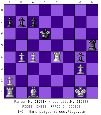 Last move : 1-0 2025 April 4 23:3:20 [Event "FICGS__CHESS__RAPID_C__000308"] [Site "FICGS"] [Date "2025.03.18"] [Round "1"] [White "Pintor,Manuel"] [Black "Leurette,Marc-Antoine"] [Result "1-0"] [WhiteElo "1751"] [BlackElo "1723"] 1.e4 e5 2.f4 d6 3.Nf3 Nc6 4.Bc4 Qe7 5.O-O Be6 6.Bxe6 Qxe6 7.Ng5 Qg6 8.d3 O-O-O 9.c3 f5 10.Qb3 Nh6 11.h3 Be7 12.Na3 Nf7 13.Nxf7 Rhf8 14.Nxd8 Nxd8 15.exf5 Rxf5 16.d4 Qg3 17.Qd1 exf4 18.Qg4 Qxg4 19.hxg4 Rf8 20.Rxf4 Rh8 21.g3 g5 22.Re4 Nc6 23.b4 Ne5 24.dxe5 dxe5 25.Rxe5 Bd6 26.Re3 Kd7 27.Nc4 h5 28.Nxd6 Kxd6 29.gxh5 Rxh5 30.c4 g4 31.Re4 1-0 Follow this game move after move (download)The passion for playing Chess is one of the most unaccountable in the world. (H.G. Wells) Sie bekommen vielleicht den Eindruck, dass die Spitzenspieler überhaupt gar nicht so stark sind. Aber das stimmt nicht. Es ist eine Illusion. Mit einem Computer an der Seite ist es sehr leicht, Urteile zu fällen, aber wenn man alleine am Brett sitzt, sieht die Sache ganz anders aus. (Vladimir Kramnik) Debió haber existido una vez en que los hombres eran semidióses, de otra manera no hubiesen podido inventar el Ajedrez. (Gustav Schenk) Mais n'est-ce pas déjà le limiter injurieusement que d'appeler les échecs un jeu? N'est-ce pas aussi une science, un art, ou quelque chose qui, comme le cercueil de Mahomet entre ciel et terre, est suspendu entre l'un et l'autre, et qui réunit un nombre incroyable de contraires ? (Stefan Zweig) Don't anthropomorphize computers - they hate it. (Anonymous)