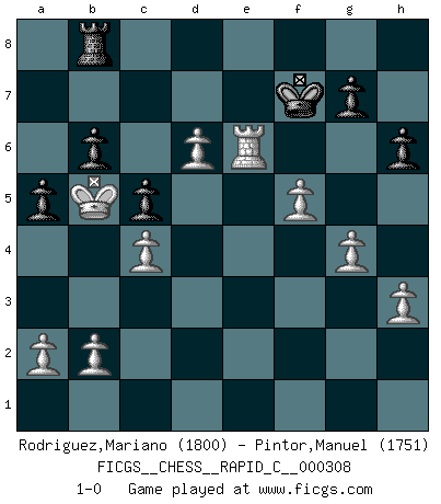 Last move : 1-0 2025 April 23 16:46:43 [Event "FICGS__CHESS__RAPID_C__000308"] [Site "FICGS"] [Date "2025.03.18"] [Round "1"] [White "Rodriguez,Mariano"] [Black "Pintor,Manuel"] [Result "1-0"] [WhiteElo "1800"] [BlackElo "1751"] 1.e4 e5 2.Nf3 Nc6 3.d4 exd4 4.Nxd4 Qf6 5.Nb5 Bc5 6.Qe2 Bb6 7.N1c3 Nge7 8.Be3 O-O 9.Bxb6 cxb6 10.O-O-O d6 11.Qe3 Bg4 12.Rxd6 Qe5 13.f4 Qc5 14.Qxc5 bxc5 15.h3 Bc8 16.Nc7 Rb8 17.Bc4 Nd4 18.Rd1 Ng6 19.N3d5 Ne6 20.Nxe6 fxe6 21.f5 Ne5 22.Ne7+ Kh8 23.Bxe6 Bxe6 24.Rxe6 Nc4 25.Rd7 Ne3 26.g4 a5 27.Nd5 Nxd5 28.exd5 Rfd8 29.Rxd8+ Rxd8 30.c4 h6 31.Kc2 Kg8 32.d6 b6 33.Kb3 Kf7 34.Ka4 Rb8 35.Kb5 1-0 Follow this game move after move (download)Nonsense was the last thing Fischer was interested in, as far as Chess was concerned. (Elie Agur) Was ist der Unterschied zwischen einem Strassenarbeiter und einem Schachspieler? --Der Schachspieler bewegt sich ab und zu. (Anonymous) Todo se encuentra en un estado de flujo y esto incluye al mundo del Ajedrez. (Mikhail Botvinnik) RxDa4 pat (...) If we don't succeed, we run the risk of failure. (George W. Bush)