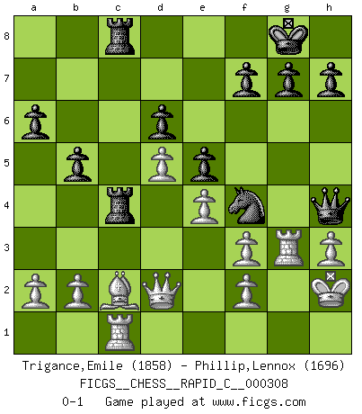 Last move : 0-1 2025 May 13 17:54:54 [Event "FICGS__CHESS__RAPID_C__000308"] [Site "FICGS"] [Date "2025.03.18"] [Round "1"] [White "Trigance,Emile"] [Black "Phillip,Lennox"] [Result "0-1"] [WhiteElo "1858"] [BlackElo "1696"] 1.e4 e5 2.Nf3 Nc6 3.Bb5 a6 4.Ba4 Nf6 5.O-O Be7 6.Re1 b5 7.Bb3 d6 8.c3 Na5 9.Bc2 c5 10.d4 cxd4 11.cxd4 Bg4 12.d5 O-O 13.h3 Bh5 14.Be3 Nc4 15.Bc1 Rc8 16.Nbd2 Nxd2 17.Bxd2 Bxf3 18.gxf3 Nh5 19.Rc1 Bg5 20.Kh2 Bf4+ 21.Bxf4 Nxf4 22.Rg1 Qh4 23.Rg3 Rc4 24.Qd2 Rfc8 0-1 Follow this game move after move (download)Chess books should be used as we use glasses: to assist the sight, although some players make use of them as if they thought they conferred sight. (Jose Raul Capablanca) Wenn sie aufgeben, dann danke ich Ihnen für das Spiel (Eventualzug beim Fernschach). (Anonymous) El Ajedrez es tan interesante por sí solo, que no es necesario un interés monetario para persuadir a una persona a que lo practique; por lo tanto, nunca se juega por dinero. (Benjamin Franklin) Je fais ceci parce que dans cinquante coups j'obtiendrai cela; je m'appelle Mikhail Moisevitch Botvinnik. (Botvinnik) Happy endings are just stories that haven't finished yet. (Jane Smith in Mr & Mrs Smith)