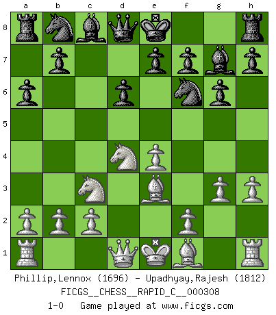 Last move : 1-0 2025 April 26 1:18:8 [Event "FICGS__CHESS__RAPID_C__000308"] [Site "FICGS"] [Date "2025.03.18"] [Round "1"] [White "Phillip,Lennox"] [Black "Upadhyay,Rajesh"] [Result "1-0"] [WhiteElo "1696"] [BlackElo "1812"] 1.e4 c5 2.Nf3 d6 3.d4 cxd4 4.Nxd4 Nf6 5.Nc3 a6 6.h3 g6 7.Be3 Bg7 8.g3 1-0 This chess game has been lost on time (started : 2025.03.18 5:1:56) Follow this game move after move (download)Place the contents of the Chess box in a hat, shake them up vigorously, pour them on the board from a height of two feet, and you get the style of Steinitz. (H. E. Bird) Kann Schach nicht schließlich das Nationalspiel der Deutschen werden? Und welche weiteren Ausblicke bieten sich dann dar! Welche Hebung des allgemeinen Kultur-Niveaus, ja der Moral, wenn das Schachbrett den Kartentisch verdrängen würde! Wahrlich, ein Ziel, des Schweißes der Edlen wert! (Siegbert Tarrasch) Yo nunca en mi vida he jugado la Defensa Francesa, que viene siendo la más aburrida de todas las Aperturas. (Wilhelm Steinitz) Les échecs, c'est l'imagination. (David Bronstein) Political correctness is subjecting us to gross incompetence. (Johann Piek)
