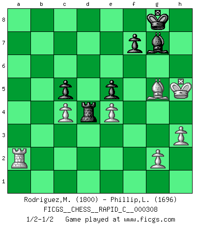 Last move : 1/2-1/2 2025 April 25 3:29:39 [Event "FICGS__CHESS__RAPID_C__000308"] [Site "FICGS"] [Date "2025.03.18"] [Round "1"] [White "Rodriguez,Mariano"] [Black "Phillip,Lennox"] [Result "1/2-1/2"] [WhiteElo "1800"] [BlackElo "1696"] 1.e4 c5 2.Nf3 Nc6 3.Bb5 g6 4.O-O Bg7 5.c3 e5 6.Bxc6 dxc6 7.Re1 Qd3 8.Re3 Qd6 9.Re1 Ne7 10.d3 O-O 11.Be3 Be6 12.Nbd2 b6 13.Nc4 Qc7 14.a4 h6 15.a5 Rab8 16.axb6 axb6 17.h3 g5 18.b4 cxb4 19.cxb4 Rfd8 20.Qc2 c5 21.bxc5 bxc5 22.Bd2 Bxc4 23.Qxc4 Qd7 24.Ra3 Ng6 25.Ba5 Rdc8 26.Bd2 Nf4 27.Rea1 Rd8 28.Kh2 Qb5 29.Ra5 Qxc4 30.dxc4 Rb2 31.Be3 Ne6 32.Kg3 Rc2 33.R5a4 h5 34.Nxg5 Nxg5 35.Bxg5 Rd3+ 36.Kh4 Rxf2 37.R4a2 Rxa2 38.Rxa2 Rd4 39.Kxh5 1/2-1/2 Follow this game move after move (download)Man is a frivolous, a specious creature, and like a Chess player, cares more for the process of attaining his goal than for the goal itself. (Dostoyevsky) Fischer ist das größte Genie, das je vom Schachhimmel heruntergestiegen ist. (Mikhail Nekhemyevich Tal) El pensamiento metódico es mas útil en el Ajedrez que la inspiración. (C. J. S. Purdy) En blitz, le Cavalier l'emporte sur le Fou. (Vlastimil Hort) The production of too many useful things results in too many useless people. (Karl Marx)
