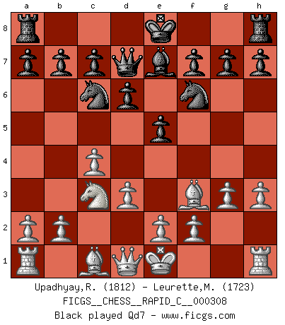 Last move : 0-1 2025 April 26 13:43:27 [Event "FICGS__CHESS__RAPID_C__000308"] [Site "FICGS"] [Date "2025.03.18"] [Round "1"] [White "Upadhyay,Rajesh"] [Black "Leurette,Marc-Antoine"] [Result "0-1"] [WhiteElo "1812"] [BlackElo "1723"] 1.c4 e5 2.Nc3 Nf6 3.g3 Nc6 4.Bg2 d6 5.d3 Be7 6.Nf3 Bg4 7.h3 Bxf3 8.Bxf3 Qd7 0-1 This chess game has been lost on time (started : 2025.03.18 5:1:56) Follow this game move after move (download)I know people who have all the will in the world, but still can't play good Chess. (Bobby Fischer) Ich bin der einzige Schachspieler, der sich während der Vorbereitungen zum Turnier verletzt hat. (Woody Allen) Preferería tener un Peón que un dedo. (Reuben Fine) Le succès, c'est être capable d'aller d'échec en échec sans perdre son enthousiasme. (Winston Churchill) Tomorrow's what you make of it. (Horatio Caine, C.S.I. Miami)