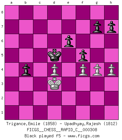 Last move : 0-1 2025 August 3 10:17:46 [Event "FICGS__CHESS__RAPID_C__000308"] [Site "FICGS"] [Date "2025.03.18"] [Round "1"] [White "Trigance,Emile"] [Black "Upadhyay,Rajesh"] [Result "0-1"] [WhiteElo "1858"] [BlackElo "1812"] 1.e4 d5 2.exd5 Qxd5 3.Nc3 Qa5 4.d4 Nf6 5.Nf3 Bf5 6.Bc4 e6 7.O-O c6 8.Bd3 Bxd3 9.Qxd3 Nbd7 10.Bd2 Qc7 11.Qc4 Bd6 12.g3 O-O 13.Qd3 Rfd8 14.Ne4 c5 15.Nxf6+ Nxf6 16.c3 cxd4 17.cxd4 Nd5 18.Qb3 Qb6 19.Qxb6 Nxb6 20.b3 Rac8 21.Rfc1 Nd5 22.Ne5 Kf8 23.Nc4 Be7 24.Be3 Bb4 25.Bd2 Rxc4 26.bxc4 Bxd2 27.cxd5 Bxc1 28.Rxc1 Rxd5 29.Rc8+ Ke7 30.Rc7+ Rd7 31.Rc4 Kd6 32.f4 Rc7 33.Rxc7 Kxc7 34.Kf2 b5 35.Ke2 Kc6 36.Kd3 Kd5 37.a3 a5 38.h3 b4 39.axb4 axb4 40.g4 f6 41.h4 f5 0-1 Follow this game move after move (download)The passed pawn is a criminal, who should be kept under lock and key. Mild measures, such as police surveillance, are not sufficient. (Nimzovitch) Smyslow ist ein Beweis dafür, dass ich noch zehn Jahre spielen kann! [der 75 jährige über den 85 jährigen] (Viktor Kortschnoi) El Ajedrez es una guerra en un tablero. El objetivo es aplastar la mente del oponente. (Bobby Fischer) Fischer est le meilleur joueur du monde et Karpov n'est qu'un joueur de bistrot. (Garry Kasparov, agé de 16 ans) The Internet is the world's largest library. It's just that all the books are on the floor. (John Allen Paulos)