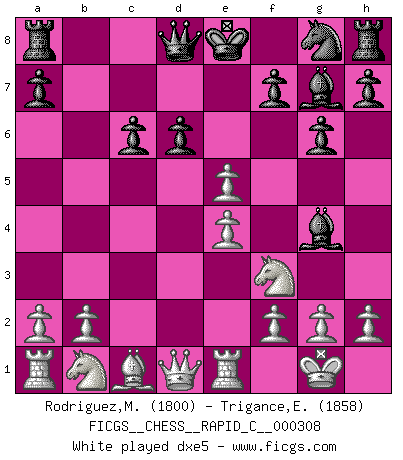 Last move : 1-0 2025 May 13 18:27:48 [Event "FICGS__CHESS__RAPID_C__000308"] [Site "FICGS"] [Date "2025.03.18"] [Round "1"] [White "Rodriguez,Mariano"] [Black "Trigance,Emile"] [Result "1-0"] [WhiteElo "1800"] [BlackElo "1858"] 1.e4 c5 2.Nf3 Nc6 3.Bb5 g6 4.Bxc6 bxc6 5.O-O Bg7 6.Re1 e5 7.c3 d6 8.d4 cxd4 9.cxd4 Bg4 10.dxe5 dxe5 11.Qxd8+ Rxd8 12.Be3 Bxf3 13.gxf3 a6 14.Na3 Nh6 15.Rac1 Rc8 16.Nc4 1-0 Follow this game move after move (download)My opponents make good moves too. Sometimes I don't take these things into consideration. (Bobby Fischer) Der Bart als Geschlechtszeichen mitten im Gesicht ist obszön. Daher gefällt er den Weibern. [Zugegeben, kein Schachzitat, aber unglaublich originell] (Arthur Schopenhauer) El Ajedrez es la vida. (Bobby Fischer) J'apprécie les joueurs d'est-indienne, c'est grâce à eux que je nourris ma famille depuis tant d'années. (Petrosian) Men never do evil so completely and cheerfully as when they do it from religious conviction. (Blaise Pascal)