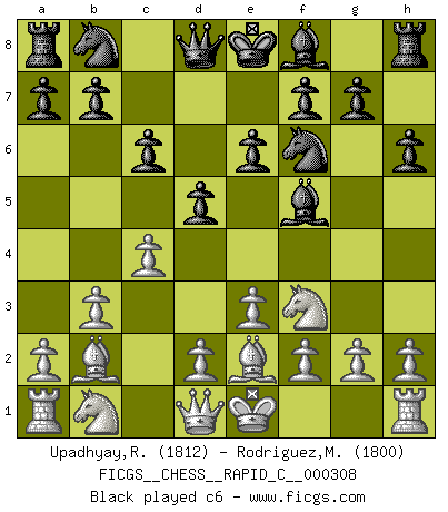 Last move : 0-1 2025 April 26 13:43:27 [Event "FICGS__CHESS__RAPID_C__000308"] [Site "FICGS"] [Date "2025.03.18"] [Round "1"] [White "Upadhyay,Rajesh"] [Black "Rodriguez,Mariano"] [Result "0-1"] [WhiteElo "1812"] [BlackElo "1800"] 1.Nf3 d5 2.e3 Nf6 3.b3 Bf5 4.Bb2 e6 5.c4 h6 6.Be2 c6 0-1 This chess game has been lost on time (started : 2025.03.18 5:1:56) Follow this game move after move (download)A passed Pawn increases in strength as the number of pieces on the board diminishes. (Capablanca) Ich habe Kasparov in Rente geschickt. (Veselin Topalov) Entre mas años cumplo, mas valoro los Peones. (Keres) Roi des jeux et jeu des rois, les échecs portent en eux un sentiment d'infini. Ils donnent à celui qui s'est efforcé d'en approfondir les arcanes l'impression de n'être pas à la mesure de l'homme; en fait, ils constituent un résumé de l'univers, un microcosme, et figurent cette grande échelle qui, dans les plans de la lumière descend jusqu'à la matière, qui des abîmes insondables remonte jusqu'en l'infini de Dieu. (Pyrame) Unless I accept my faults I will most certainly doubt my virtues. (Hugh Prather)
