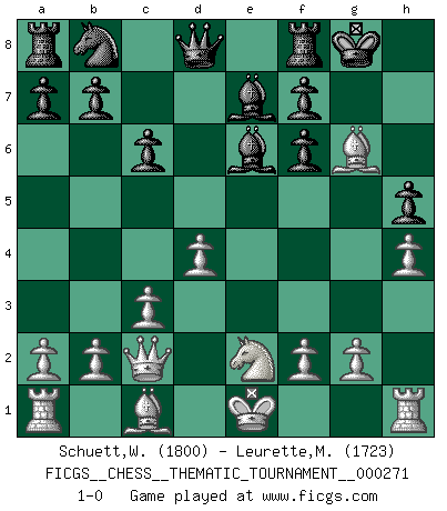 Last move : 1-0 2025 April 3 12:6:6 [Event "FICGS__CHESS__THEMATIC_TOURNAMENT__000271"] [Site "FICGS"] [Date "2025.03.19"] [Round "1"] [White "Schuett,Wilhelm"] [Black "Leurette,Marc-Antoine"] [Result "1-0"] [WhiteElo "1800"] [BlackElo "1723"] 1.e4 c6 2.d4 d5 3.Nc3 dxe4 4.Nxe4 Nf6 5.Nxf6+ exf6 6.c3 Be7 7.Bd3 Be6 8.Ne2 O-O 9.Qc2 g6 10.h4 h5 11.Bxg6 1-0 Follow this game move after move (download)Chess problems demand from the composer the same virtues that characterize all worthwhile art: originality, invention, conciseness, harmony, complexity, and splendid insincerity. (Vladimir Nabokov) Zu meiner Zeit war ein 20 jähriger ein junger Spieler, heute ist er ein Veteran. (Garry Kasparov) La caracteristica mas importante en la posición del Ajedrez es la actividad de las piezas. Esto es absolutamente fundamental en todas las fases del juego: Apertura, Juego Medio y especialmente Finales. La limitación primordial en la actividad de una pieza, es la estructuración de los Peones. (Michael Stean) Le thème de l'attaque double intervient d'une manière ou d'une autre dans l'immense majorité des combinaisons. (Youri Averbakh) Creativity involves breaking out of established patterns in order to look at things in a different way. (Edward De Bono)