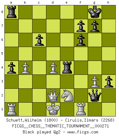 Last move : 0-1 2025 October 22 23:6:44 [Event "FICGS__CHESS__THEMATIC_TOURNAMENT__000271"] [Site "FICGS"] [Date "2025.03.19"] [Round "1"] [White "Schuett,Wilhelm"] [Black "Cirulis,Ilmars"] [Result "0-1"] [WhiteElo "1800"] [BlackElo "2268"] 1.e4 c6 2.d4 d5 3.Nc3 dxe4 4.Nxe4 Nf6 5.Nxf6+ exf6 6.c3 Bd6 7.Bd3 O-O 8.Qc2 h5 9.Ne2 Re8 10.O-O h4 11.Bf4 Na6 12.a4 Nc7 13.Bxd6 Qxd6 14.b4 h3 15.g3 a5 16.Qd2 axb4 17.cxb4 Ne6 18.Bc4 Ng5 19.f3 b5 20.Bb3 bxa4 21.Bc4 Be6 22.Bxe6 Qxe6 23.Kf2 Nxf3 24.Kxf3 Qe4+ 25.Kf2 Qg2+ 26.Ke1 Re4 27.Rf2 Qg1+ 28.Rf1 Qxh2 29.Kd1 Qg2 30.Re1 Rae8 31.Rxa4 h2 32.Ra1 Rxe2 33.Rxe2 Qg1+ 0-1 This chess game has been lost on time (started : 2025.03.19 23:37:31) Follow this game move after move (download)Chess is a more highly symbolic game, but the aggressions are therefore even more frankly represented in the play. It probably began as a war game; that is, the representation of a miniature battle between the forces of two kingdoms. (Karl Meninger) Mein erstes Ziel war nicht, die Partie zu gewinnen, sondern eine Figur zu opfern. -- der junge (Wilhelm Steinitz) El juego del Ajedrez no es solamente una diversión quieta; algunas cualidades muy valuables de la mente se pueden adquirir y cultivar con el, como convertirlos en habitos disponibles para toda ocasión; ya que la vida es algo así como el Ajedrez. (Benjamin Franklin) Les échecs sont plus proches de l'art de l'assassinat que de l'art de la guerre. (Arturo Perez-Reverte) Plans are ideas that never come to fruition. (Daniel Parmet)