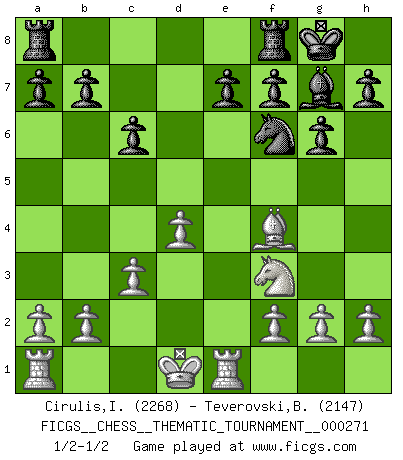 Last move : 1/2-1/2 2025 March 22 22:29:58 [Event "FICGS__CHESS__THEMATIC_TOURNAMENT__000271"] [Site "FICGS"] [Date "2025.03.19"] [Round "1"] [White "Cirulis,Ilmars"] [Black "Teverovski,Bogoljub"] [Result "1/2-1/2"] [WhiteElo "2268"] [BlackElo "2147"] 1.e4 c6 2.d4 d5 3.Nc3 dxe4 4.Nxe4 Nf6 5.Qd3 Nxe4 6.Qxe4 Qd5 7.Bd3 Qxe4+ 8.Bxe4 g6 9.Nf3 Bg7 10.c3 Be6 11.Bf4 Bd5 12.Nd2 Nd7 13.Kd1 Nf6 14.Bf3 Bxf3+ 15.Nxf3 O-O 16.Re1 1/2-1/2 Follow this game move after move (download)White lost because he failed to remember the right continuation and had to think up the moves himself. (Siegbert Tarrasch) Wenn du nicht weißt was du tun sollst, warte bis dein Gegner eine Idee hat. Sie wird sicher schlecht sein. (Siegbert Tarrasch) El Ajedrez es en su esencia, un juego. En su forma, un arte. Y en su ejecución, una ciencia. (Baron Tassilo) Aux échecs, l'amour-propre est satisfait quand on remporte la victoire, mais il n'y a pas de honte à être battu. (Benjamin Franklin) Wisdom doesn't necessarily come with age. Sometimes age just shows up all by itself. (Tom Wilson)