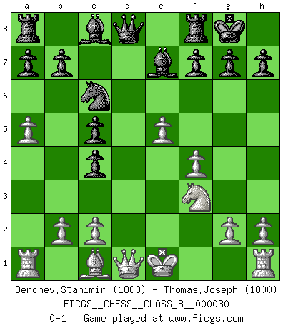 Last move : 0-1 2007 October 5 21:24:20 [Event "FICGS__CHESS__CLASS_B__000030"] [Site "FICGS"] [Date "2007.09.30"] [Round "1"] [White "Denchev,Stanimir"] [Black "Thomas,Joseph"] [Result "0-1"] [WhiteElo "1800"] [BlackElo "1800"] 1.d4 Nf6 2.f4 c5 3.d5 e6 4.Nc3 exd5 5.Nxd5 Be7 6.Nf3 O-O 7.e3 Nxd5 8.e4 Nb6 9.a4 d5 10.e5 Nc6 11.a5 Nc4 12.Bxc4 dxc4 0-1 Canard Opening Kingside Castling by player Black (move 6) Player Black won this chess game. Follow this game move after move (download)I like to say that Bobby Fischer was the greatest player ever. But what made Fischer a genius was his ability to blend an American freshness and pragmatism with Russian ideas about strategy. (Bruce Pandolfini) Das typische an einem Großmeister ist, daß er eine gewonnene Position schnell und schmerzlos gewinnt. (Irving Chernev) Aquellos que dicen que entienden al Ajedrez, no entienden nada. (Robert Hubner) La solitude du joueur d'Echecs à l'approche du mat est semblable à celle du condamné. (Francis Szpiner) Experiences are the keys to life. (Daniel Parmet)