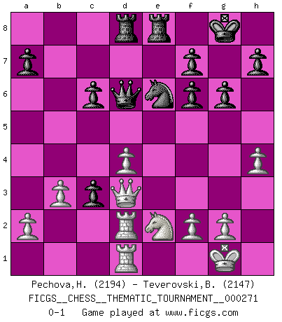 Last move : 0-1 2025 July 23 1:44:9 [Event "FICGS__CHESS__THEMATIC_TOURNAMENT__000271"] [Site "FICGS"] [Date "2025.03.19"] [Round "1"] [White "Pechova,Hana"] [Black "Teverovski,Bogoljub"] [Result "0-1"] [WhiteElo "2194"] [BlackElo "2147"] 1.e4 c6 2.d4 d5 3.Nc3 dxe4 4.Nxe4 Nf6 5.Nxf6+ exf6 6.Bc4 Na6 7.Ne2 Bd6 8.O-O Nc7 9.Bf4 Be6 10.Bxe6 Nxe6 11.Bxd6 Qxd6 12.Qd3 O-O 13.Rad1 b5 14.Rd2 Rad8 15.Rfd1 g6 16.b3 Rfe8 17.h4 b4 18.c4 bxc3 0-1 This chess game has been lost on time (started : 2025.03.19 23:37:31) Follow this game move after move (download)Chess is imagination. (David Bronstein) Über Frauen: Chess is better. (Robert James Fischer) El Rey es una pieza de pelea. ¡Usenlo!. (Wilhelm Steinitz) On est toujours la mazette de quelqu'un d'autre. (Anonyme) There are two kinds of people in the world, my friend. Those who have a loaded gun and those who dig. You dig ! (Blondie in The Good, The Bad and The Ugly)
