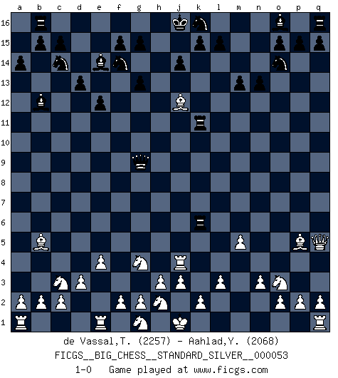 Last move : 1-0 2025 May 26 16:54:37 [Event "FICGS__BIG_CHESS__STANDARD_SILVER__000053"] [Site "FICGS"] [Date "2025.03.20"] [Round "2"] [White "de Vassal,Thibault"] [Black "Aahlad,Yeturu"] [Result "1-0"] [WhiteElo "2257"] [BlackElo "2068"] 1.j2-k4 p16-o14 2.h1-l4 j15-k13 3.h2-g4 e15-e13 4.e2-e4 b16-c14 5.b1-c3 f16-b12 6.f1-b5 h16-o10 7.m2-m4 m15-m13 8.p1-o3 l16-p12 9.k1-h2 g16-f14 10.l1-p5 d15-d13 11.d2-d3 m16-m14 12.m4-m5 m14-l14 13.k4-l6 h15-g13 14.n2-n3 c16-l8 15.c1-l9 o10-o9 16.l4-b13 a16-b16 17.l9-g13 h14-g13 18.l6-n7 o9-g9 19.n7-l8 p12-l8 20.m1-m4 e16-h16 21.l2-l3 n15-n13 22.o1-j6 h16-h8 23.m4-j4 a15-a14 24.b13-d11 e13-e12 25.d11-k11 l8-e14 26.j6-f9 l14-l11 27.k11-p6 h8-k8 28.f9-k13 l11-k11 29.k13-j12 k8-k6 30.p6-q5 1-0 Follow this game move after move (download)I like to say that Bobby Fischer was the greatest player ever. But what made Fischer a genius was his ability to blend an American freshness and pragmatism with Russian ideas about strategy. (Bruce Pandolfini) Kann Schach nicht schließlich das Nationalspiel der Deutschen werden? Und welche weiteren Ausblicke bieten sich dann dar! Welche Hebung des allgemeinen Kultur-Niveaus, ja der Moral, wenn das Schachbrett den Kartentisch verdrängen würde! Wahrlich, ein Ziel, des Schweißes der Edlen wert! (Siegbert Tarrasch) Los Peones son nacidos libres, y aún así, se encuentran encadenados por todos lados. (Rick Kennedy) Le moment que je préfère le plus dans une rencontre, c'est celui où je sens que la personnalité de l'adversaire se brise. (Robert Fischer) Be who you are, and say what you feel because those who mind don't matter, and those who matter don't mind. (Dr Seuss)