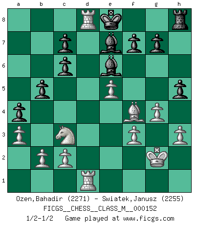 Last move : 1/2-1/2 2025 May 9 21:53:16 [Event "FICGS__CHESS__CLASS_M__000152"] [Site "FICGS"] [Date "2025.03.21"] [Round "1"] [White "Ozen,Bahadir"] [Black "Swiatek,Janusz"] [Result "1/2-1/2"] [WhiteElo "2271"] [BlackElo "2255"] 1.e4 e5 2.Nf3 Nc6 3.Bb5 Nf6 4.O-O Nxe4 5.d4 Nd6 6.Bxc6 dxc6 7.dxe5 Nf5 8.Qxd8+ Kxd8 9.Nc3 a5 10.h3 Ke8 11.Rd1 Be7 12.g4 Nh4 13.Nxh4 Bxh4 14.f3 a4 15.Bf4 Be7 16.Kg2 h5 17.a3 Be6 18.Rd2 b5 19.Rad1 Rd8 20.Rxd8+ 1/2-1/2 Follow this game move after move (download)A man without frontiers. He didn't divide the East and the West, he brought them together in their admiration for him. (Ljubomir Ljubojevic, about Bobby Fischer's death) Privat ist Kortschnoi kein schlechter Mensch, sehr sympathisch. Aber während des Spiels ist er grausam. Er will dich töten. (Miguel Najdorf) Cada Peón es potencialmente una Reina. (James Mason) La tactique, c'est ce que vous faites quand il y a quelque chose à faire; la stratégie, c'est ce que vous faites quand il n'y a rien à faire. (Savielli Tartacower) Shallow men believe in luck. Strong men belive in cause and effect. (Ralph Waldo Emerson)