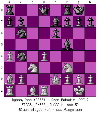 Last move : 0-1 2025 July 9 16:1:26 [Event "FICGS__CHESS__CLASS_M__000152"] [Site "FICGS"] [Date "2025.03.21"] [Round "1"] [White "Dyson,John"] [Black "Ozen,Bahadir"] [Result "0-1"] [WhiteElo "2239"] [BlackElo "2271"] 1.c4 c6 2.e4 d5 3.cxd5 cxd5 4.exd5 Nf6 5.Nc3 Nxd5 6.Bc4 Nb6 7.Bb3 Nc6 8.Nf3 Bf5 9.d4 e6 10.O-O Be7 11.a4 Na5 12.Ba2 O-O 13.Qe2 Nc6 14.Rd1 Nb4 15.Bb3 N6d5 16.a5 Rc8 0-1 This chess game has been lost on time (started : 2025.03.21 1:22:57) Follow this game move after move (download)Chess is thirty to forty percent psychology. You don't have this when you play a computer. I can't confuse it. (Judith Polgar) Das Schachspiel ist ein See, in welchem eine Mücke baden und ein Elefant ertrinken kann. (Emanuel Lasker) Hasta este punto, las blancas han seguido un análisis bien conocido. Pero ahora el hace un error fatal: empieza a usar su propia cabeza. (Siegbert Tarrasch) Il n'y a pas de prix trop élevé au scalp de l'ennemi. (Koblentz) I teach you to lie, cheat and steal, and as soon as my back's turned you wait in line ? (Gregory House, House M.D.)