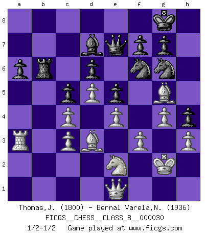 Last move : 1/2-1/2 2007 November 10 23:54:18 [Event "FICGS__CHESS__CLASS_B__000030"] [Site "FICGS"] [Date "2007.09.30"] [Round "1"] [White "Thomas,Joseph"] [Black "Bernal Varela,Nelson"] [Result "1/2-1/2"] [WhiteElo "1800"] [BlackElo "1936"] 1.c4 Nf6 2.Nc3 e6 3.d4 Bb4 4.Qc2 O-O 5.e4 c5 6.a3 Bxc3+ 7.bxc3 d6 8.Bd3 Nc6 9.Ne2 e5 10.d5 Ne7 11.f3 Ng6 12.O-O Nh5 13.g3 Bh3 14.Rf2 Re8 15.Rb1 b6 16.Be3 Bd7 17.Qd2 Nf6 18.g4 h5 19.Bg5 h4 20.R2f1 Qe7 21.Rb2 Bc8 22.a4 Bd7 23.Ra1 Reb8 24.Qe1 Be8 25.h3 Bd7 26.Kg2 Be8 27.Qb1 Rb7 28.a5 Rab8 29.axb6 Rxb6 30.Rxb6 Rxb6 31.Qe1 a6 32.Ra3 Bd7 1/2-1/2 English Opening Kingside Castling by player Black (move 4) Kingside Castling by player White (move 12) This chess game ended in a draw. Follow this game move after move (download)I love all positions. Give me a difficult positional game, I will play it. But totally won positions, I cannot stand them. (Hein Donner) Wenn Dein Gegner dir ein Remis anbietet, versuch herauszufinden, weshalb er glaubt schlechter zu stehen. (Nigel Short) Un mal día en el Ajedrez, es mejor que cualquier buen día en el trabajo. (Anonymous) Les échecs c'est le défi de l'alpiniste, toujours plus haut, prêt à tout pour monter à l'assaut du Roi ennemi. Les échecs, c'est de la musique en mouvement, un ballet majestueux pour les yeux. C'est de la poésie composée par les fantômes du passé qui au même titre que Rimbaud ou Verlaine méritent notre admiration. Les échecs, c'est de la peinture ou le moindre mouvement modifie le tableau pour en faire un Picasso ou un Van Gogh. Les échecs, c'est tout et rien, c'est la vie et la mort. Jjulie33 sur le forum de France-Echecs. Methinks King Thibault should dub Marius Zubac a knight of the square board... I mean table, henceforth addressing him as Sir Marius, and bestow on him a suitable land from the kingdom of FICGS & marry him off to a worthy, fair maiden, lest he slice our heads with his mighty sword in his wrath. (Dinesh De Silva)