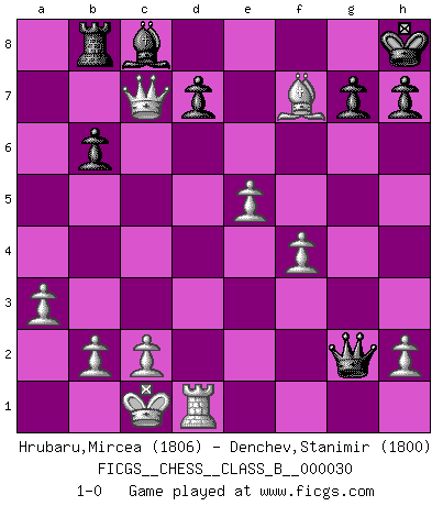 Last move : 1-0 2007 October 24 8:49:21 [Event "FICGS__CHESS__CLASS_B__000030"] [Site "FICGS"] [Date "2007.09.30"] [Round "1"] [White "Hrubaru,Mircea"] [Black "Denchev,Stanimir"] [Result "1-0"] [WhiteElo "1806"] [BlackElo "1800"] 1.e4 c5 2.Nf3 e6 3.d4 cxd4 4.Nxd4 Nf6 5.Nc3 Bb4 6.e5 Nd5 7.Bd2 Qa5 8.Nb3 Qc7 9.Nxd5 Bxd2+ 10.Qxd2 exd5 11.Qxd5 O-O 12.O-O-O Nc6 13.f4 Nb4 14.Qe4 a5 15.a3 a4 16.Qxb4 axb3 17.Qxb3 b6 18.Rd6 Rb8 19.Bb5 Re8 20.Rhd1 Re6 21.Bc4 Rxd6 22.Rxd6 Qc5 23.Bxf7+ Kh8 24.Qc4 Qg1+ 25.Rd1 Qxg2 26.Qc7 1-0 Sicilian : Pin, Koch variation Kingside Castling by player Black (move 11) Queenside Castling by player White (move 12) Player White won this chess game. Follow this game move after move (download)That's what Chess is all about. One day you give your opponent a lesson, the next day he gives you one. (Bobby Fischer) Die Fehler sind da, Sie warten nur darauf gemacht zu werden. (Savielly Grigorievitsch Tartakower) Es el objetivo de la escuela moderna no tratar cada posición de acuerdo a una regla general, sino de acuerdo al principio inherente en la posición. (Richard Reti) Les Echecs sont et restent toujours un combat, un combat intégral comme la boxe, la lutte ou un autre sport, et où il doit y avoir un vainqueur et un vaincu. (Joseph Emil Diemer) Pushing plastic is for the many, pushing virtual pieces is for the fewer, pushing wood is for the very few. (Normajean Yates)