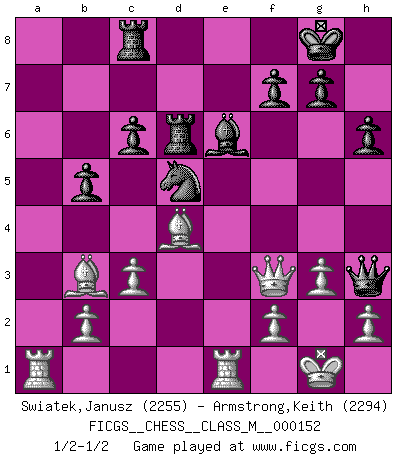 Last move : 1/2-1/2 2025 May 12 7:19:7 [Event "FICGS__CHESS__CLASS_M__000152"] [Site "FICGS"] [Date "2025.03.21"] [Round "1"] [White "Swiatek,Janusz"] [Black "Armstrong,Keith"] [Result "1/2-1/2"] [WhiteElo "2255"] [BlackElo "2294"] 1.e4 e5 2.Nf3 Nc6 3.Bb5 a6 4.Ba4 Nf6 5.O-O Be7 6.Re1 b5 7.Bb3 O-O 8.c3 d5 9.exd5 Nxd5 10.Nxe5 Nxe5 11.Rxe5 c6 12.Re1 Bd6 13.d3 Bf5 14.Qf3 Qh4 15.g3 Qh3 16.Be3 Bxd3 17.Nd2 Bf5 18.Bd4 Rfd8 19.Qh1 Rac8 20.a4 Be6 21.axb5 axb5 22.Ne4 h6 23.Nxd6 Rxd6 24.Qf3 1/2-1/2 Follow this game move after move (download)Suddenly it was obvious to me in my analysis I had missed what Fischer had found with the greatest of ease at the board. (Mikhail Botvinnik) Matt entspricht nicht immer den Tatsachen. (Savielly Grigorievitsch Tartakower) No nos podemos resistir a la fascinación de un sacrificio ya que la pasión por los sacrificios es parte de la naturaleza de un jugador de Ajedrez. (Rudolf Spielman) Les pièces de l'échiquier étaient impitoyables. Elles le retenaient, elles l'absorbaient. Il y avait de l'horreur en cela, mais aussi une harmonie unique. Car, qu'y a-t-il dans le monde, à part les échecs ? (V. Nabokov) Perhaps the current trend of many chess professionals taking up the more lucrative pastime of poker is not a wholly negative one. It may not be too late for humans to relearn how to take risks in order to innovate and thereby maintain the advanced lifestyles we enjoy. And if it takes a poker-playing supercomputer to remind us that we can't enjoy the rewards without taking the risks, so be it. (The Chess Master and the Computer, by Garry Kasparov - 2010)