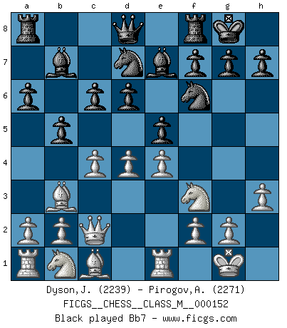 Last move : 0-1 2025 July 12 0:31:34 [Event "FICGS__CHESS__CLASS_M__000152"] [Site "FICGS"] [Date "2025.03.21"] [Round "1"] [White "Dyson,John"] [Black "Pirogov,Andrey Mikhaylovich"] [Result "0-1"] [WhiteElo "2239"] [BlackElo "2271"] 1.e4 e5 2.Nf3 Nc6 3.Bb5 a6 4.Ba4 Nf6 5.O-O Be7 6.Re1 b5 7.Bb3 d6 8.c3 O-O 9.h3 Nb8 10.d4 Nbd7 11.c4 c6 12.Qc2 Bb7 0-1 Follow this game move after move (download)Every Chess master was once a beginner. (Chernev) Mein erstes Ziel war nicht, die Partie zu gewinnen, sondern eine Figur zu opfern. -- der junge (Wilhelm Steinitz) Fischer era un maestro de claridad y un Rey del posicionamiento astuto. Sus oponentes podían ver hacia donde se dirigía pero eran impotentes para detenerlo. (Bruce Pandolfini) Le thème de l'attaque double intervient d'une manière ou d'une autre dans l'immense majorité des combinaisons. (Youri Averbakh) Imagination is more important than knowledge. Knowledge is limited. Imagination encircles the world. (Albert Einstein)