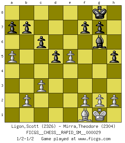 Last move : 1/2-1/2 2025 March 31 21:44:39 [Event "FICGS__CHESS__RAPID_SM__000029"] [Site "FICGS"] [Date "2025.03.23"] [Round "1"] [White "Ligon,Scott"] [Black "Mirra,Theodore"] [Result "1/2-1/2"] [WhiteElo "2326"] [BlackElo "2304"] 1.e4 e5 2.Nf3 Nc6 3.Bb5 Nf6 4.O-O Nxe4 5.Re1 Nd6 6.Nxe5 Be7 7.Bf1 Nxe5 8.Rxe5 O-O 9.d4 Bf6 10.Re1 Re8 11.c3 Rxe1 12.Qxe1 Ne8 13.Bf4 d5 14.Nd2 Bf5 15.Qe2 Nd6 16.a4 Qd7 17.Qf3 Ne4 18.Nxe4 Bxe4 19.Qg3 c6 20.a5 Re8 21.Re1 h5 22.Bg5 Bxg5 23.Qxg5 Bg6 24.Rxe8+ Qxe8 25.Qe5 Qxe5 26.dxe5 1/2-1/2 Follow this game move after move (download)Some sacrifices are sound; the rest are mine. (Mikhail Tal) Dein Körper muss in Topform sein. Dein Schach verfällt, wenn dein Körper verfällt. Der Körper kann nicht vom Geist getrennt werden. (Robert James Fischer) Botvinnik trató de alejar el misterio referente al Ajedrez, siempre relacionandolo a situaciones de la vida diaria. Solía llamar al Ajedrez un problema inexacto típico, similar a aquellos en que la gente tiene siempre que resolver a cada día. (Garry Kasparov) Un journaliste : 'Vous préférez avoir une dame de plus sur l'échiquier ou au lit ?' Boris Spassky : 'Ca dépend de la position.' The production of too many useful things results in too many useless people. (Karl Marx)
